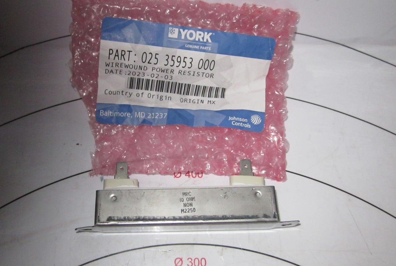 The York 025-35953-000 resistor is a genuine OEM electrical component designed for use in York HVAC equipment and control circuits. This resistor helps regulate electrical current within the system, protecting sensitive components and maintaining stable electrical performance.