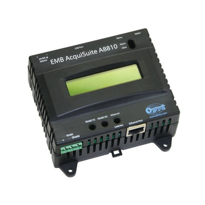 The A8810 AcquiSuite data acquisition server for embedded applications allows users to collect energy data from meters and environmental sensors and send it via Modbus communication protocol (wired or wireless using the H8830) to IP-based applications. No software is required. Operation is plug-and-play, and information can be accessed using any web browser. While the A8810 suppports Modbus serial input. The compact housing and industrial temperature range make the A8810 ideal for embedded applications. Reduce development time and speed up integration by collecting and distributing energy data directly from your equipment.
