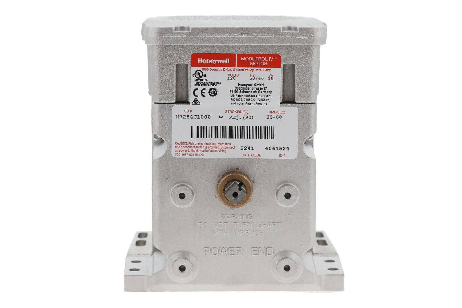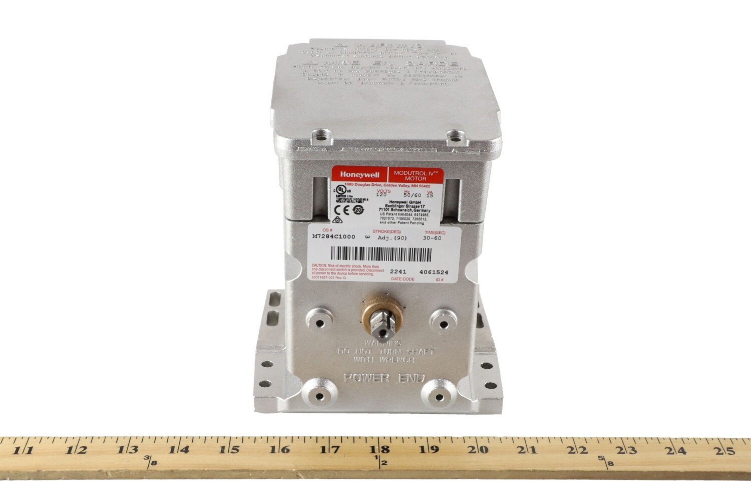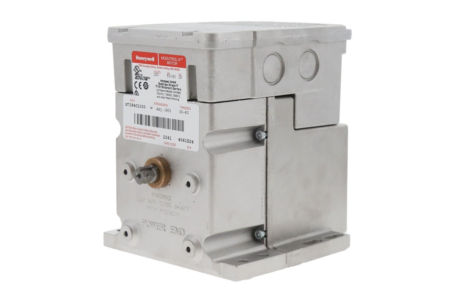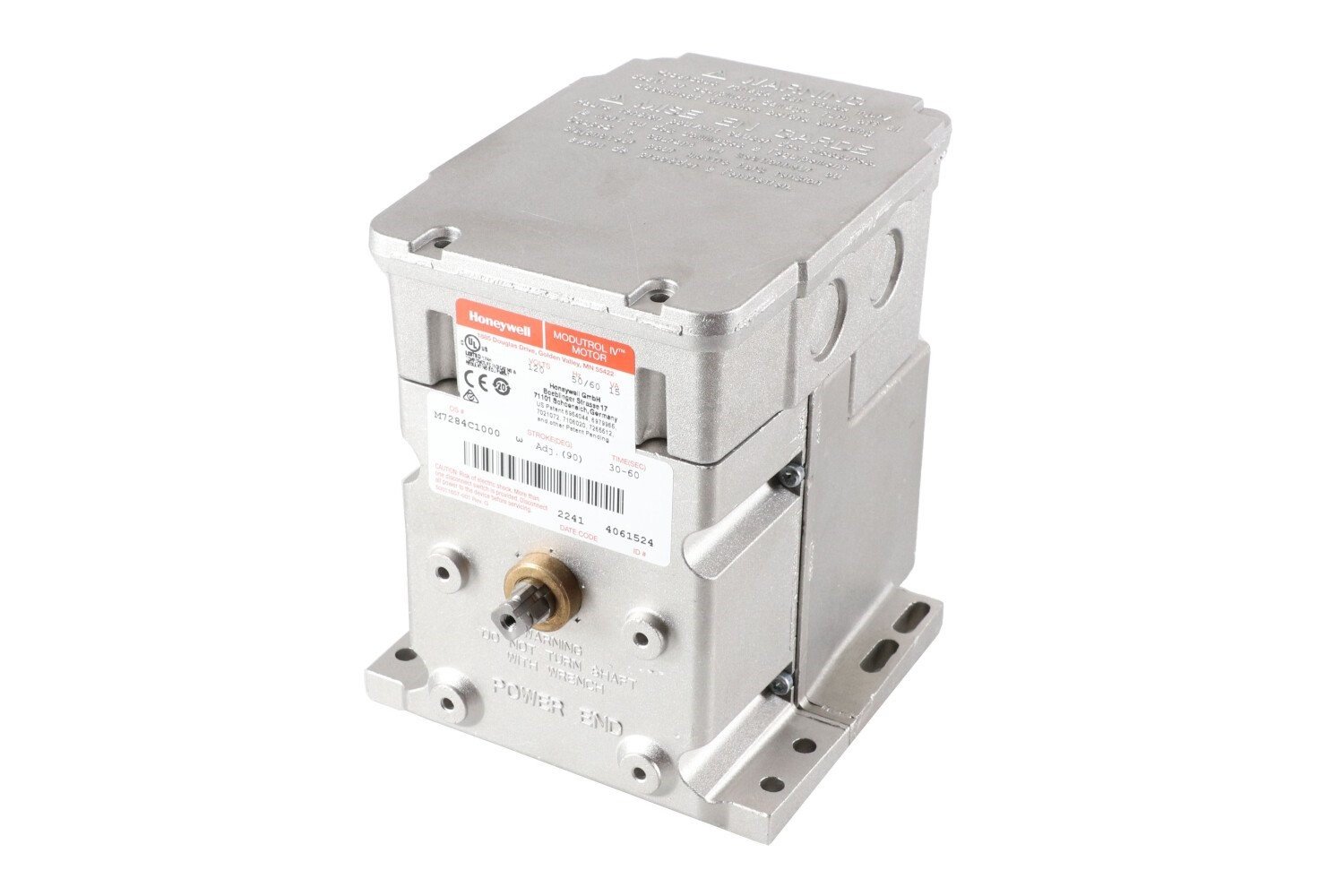 The Honeywell M7284C1000 is a foot-mounted, non-spring return modulating actuator in the Modutrol IV line. Engineered for HVAC and control systems, it offers 150 lb-in torque, adjustable stroke (90° to 160°), and dual internal auxiliary switches. This actuator allows smooth proportional control via 4–20 mA input, making it ideal for valves or dampers requiring precise positioning.