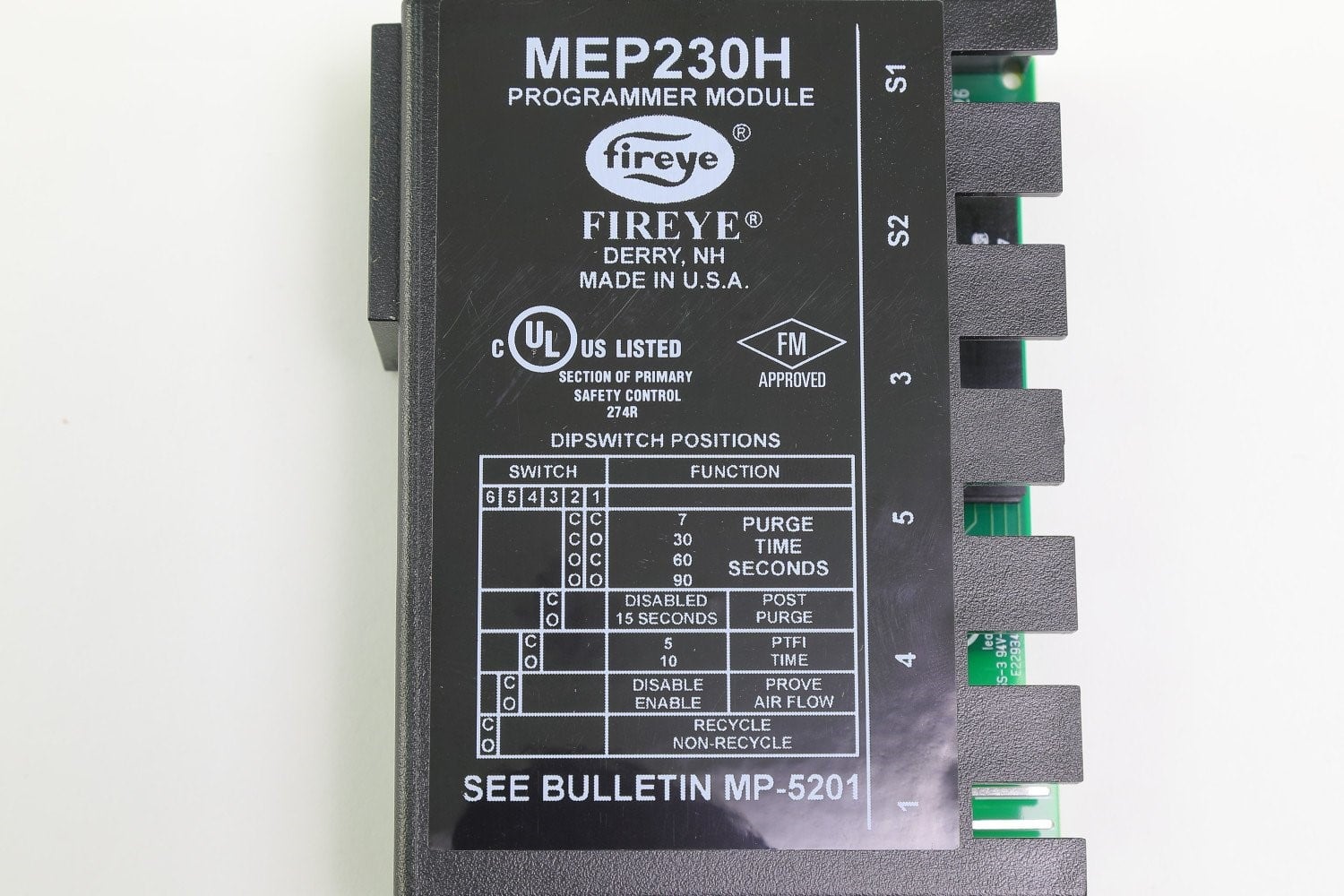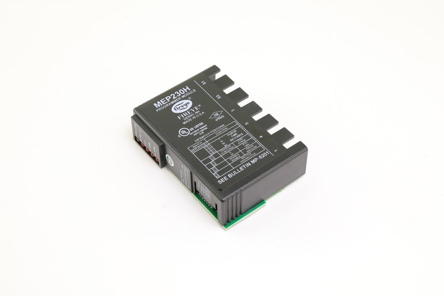 The Fireye MEP230H is a flame safeguard programmer module used with the Fireye MicroM system. This module provides burner sequencing, pilot stabilization, and flame supervision in ON/OFF burner systems. It enhances ignition reliability by including a built-in 8-second pilot stabilization period while maintaining selectable purge and ignition timing options.