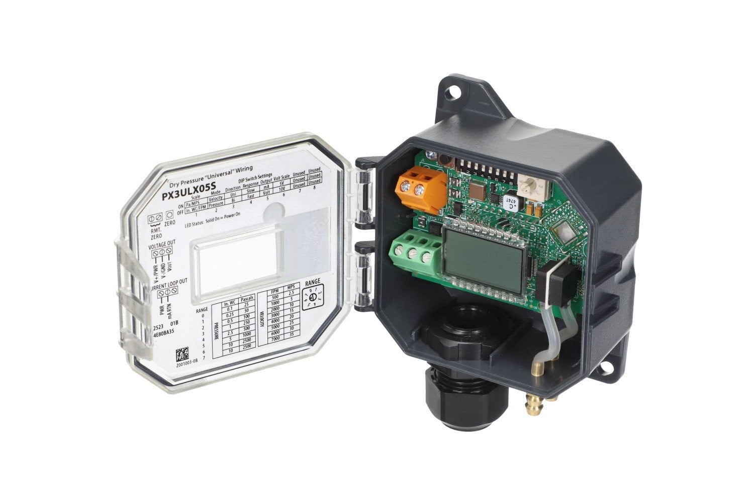 The PX3 transducer can measure either air pressure or velocity with the flip of a switch. The PX3 is available in three installation configurations: duct, panel or universal. Duct and panel models have two pressure and velocity options: 0-1 in. WC / 0-3,000 ft/min or 1-10 in. WC / 3,000-6,000 ft/min with four field-selectable subranges. The universal model comes in one pressure/velocity range: 0-10 in. WC / 0-7,000 ft/min with seven field-selectable sub-ranges for pressure and eight for velocity. All variants are available with and without display. The PX3 has an IP65/NEMA 4 environmental rating and a 5-year limited warranty.