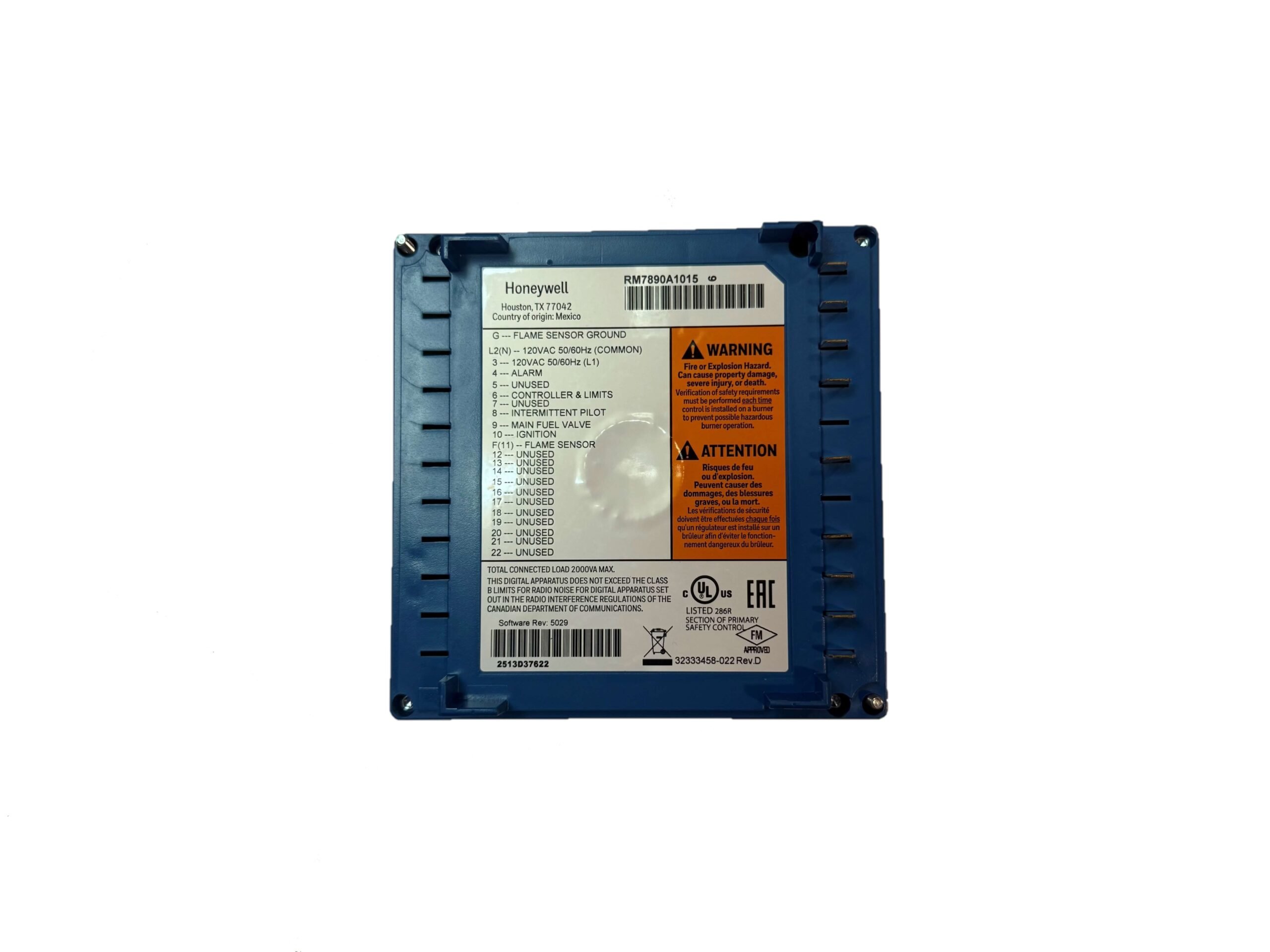 The Honeywell RM7890A1015 Burner Control On-Off Primary Control, 120Vac, Intermittent Pilot, Intermittent Main Flame Establishing Period, 4 Second or 10 Second Pilot Flame Establishing Period,Five LEDs Provide Sequence Information, Nonvolatile Memory, Functions Include Automatic Burner Sequencing