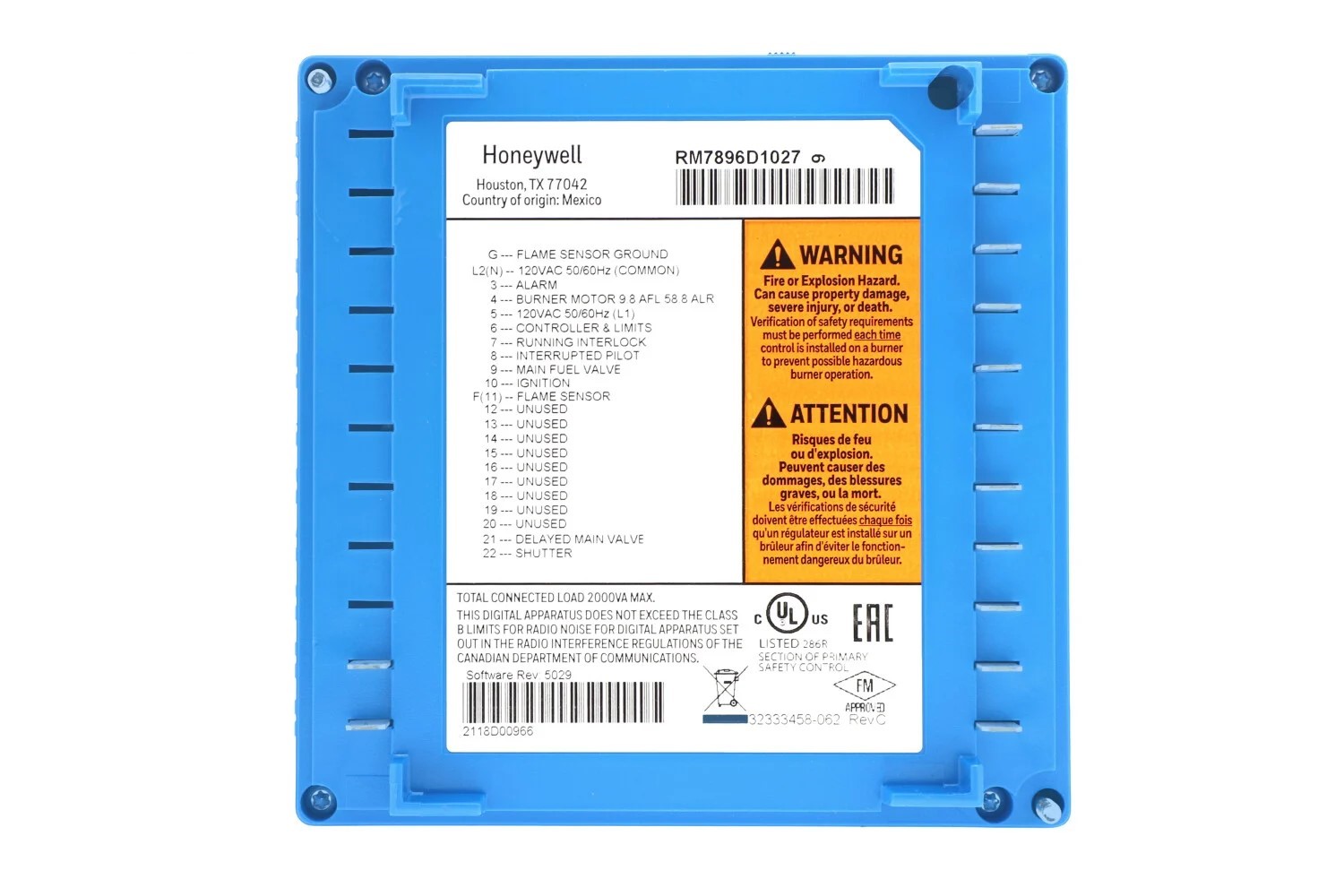 The Honeywell RM7896D1027 Burner Control 120V, 50/60 HZ. Switch CHECK. 15 SEC POSTPURGE. PURGE LED INSTEAD OF STANDARD Flame LED. Power LED BLINKS ALARM CODE ON LOCKOUT.