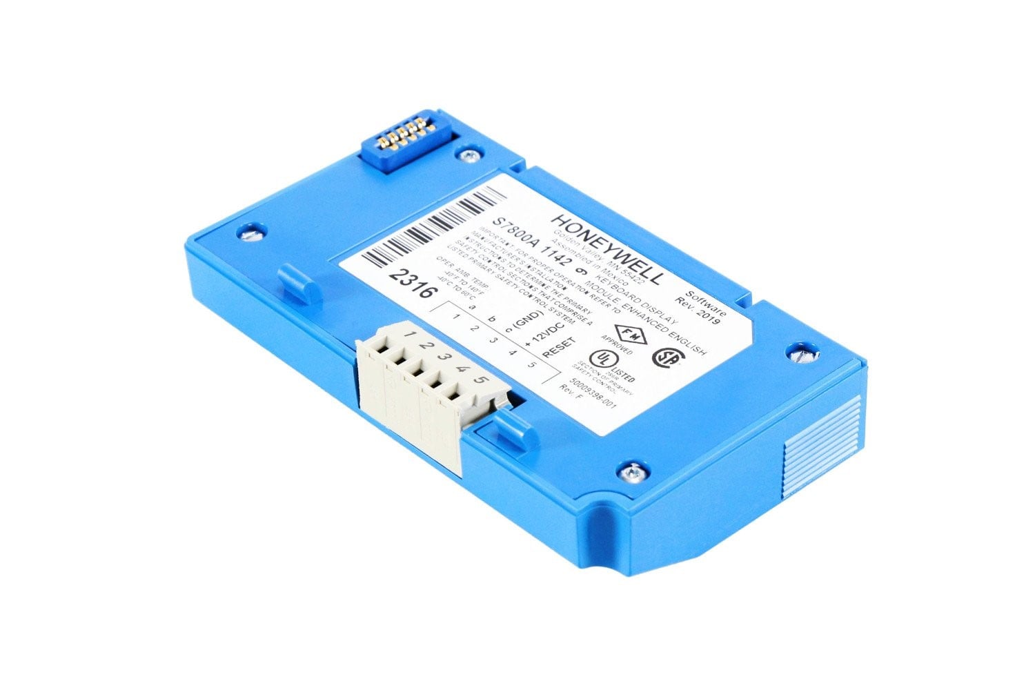 The Honeywell S7800A1142 is a plug-in Keyboard Display Module (KDM) designed for use with Honeywell 7800 Series burner control systems. It provides a two-row by twenty-column alphanumeric display and a keypad interface to show burner sequence status, diagnostic messages, first-out faults, timing information, and other important system data. This module also supports remote or local annunciation, system reset, diagnostic reporting, and programming of advanced features such as valve proving and annunciator customization.