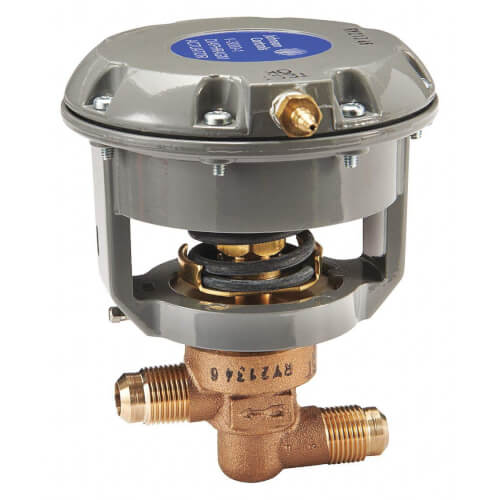 The 1/2-inch flared connection valve line accurately regulates the flow of hot or cold water in small HVAC terminal units. The V-3766, V-3966, and V-4332 1/2-inch valves are available with a factory-installed V-3000-1 exposed type pneumatic actuator. V-3000-2 enclosed actuators are also available (order separately).